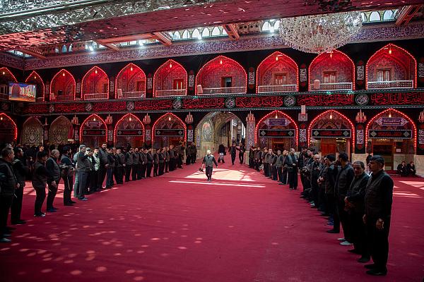ويتولى قسم حفظ النظام في العتبة المقدسة وبمساندة عدد من المتطوعين تنظيم دخول مواكب العزاء من الرجال والنساء، عبر أبواب الصحن الشريف، إلى جانب تهيئة منابر داخل الصحن للمواكب.