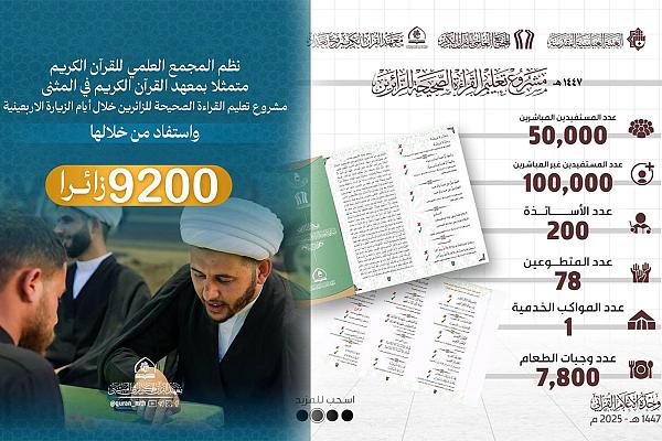وأقام معهد القرآن الكريم/ فرع بغداد ثماني محطات مركزية للمشروع، قدّمت خدماتها لـ 50 ألف زائر في زيارة الأربعين، وتحت إشراف 200 أستاذ مختص، وبمشاركة أكثر من 75 متطوعًا.