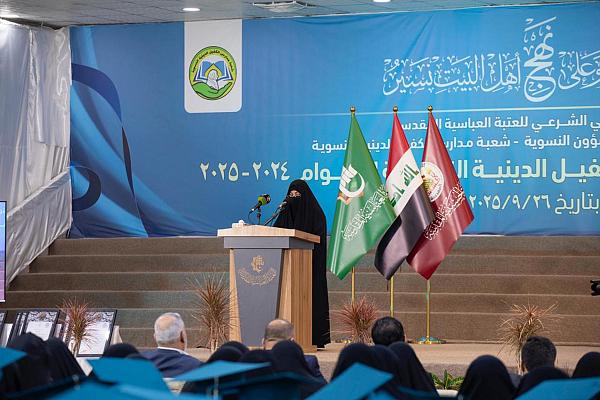 جاء ذلك في أثناء الكلمة التي ألقتها السيدة أفراح امتحان، إحدى خريجات مدارس الكفيل، في حفل تخرج طالبات شعبة مدارس الكفيل الدينية النسوية التابعة لمكتب المتولي الشرعي للشؤون النسوية في العتبة المقدسة، الذي يُقام تحت شعار (بالعلم نرتقي وعلى نهج أهل البيت -عليهم السلام- نسير).