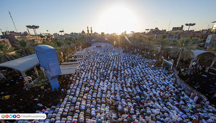 وأضاف: "من الرّحاب الطاهرة لمرقدي الإمام الحسين وأخيه أبي الفضل العباس(عليهما السلام) وبقلوب خاشعة وأجواء إيمانية وروحانية معمورة، أنهت الحشود المؤمنة مراسيمها العبادية الخاصّة بإحياء يوم وليلة عرفة وصلاة عيد الأضحى المبارك، والتي تعدّ من الزيارات المليونية التي تشهدُها عتباتُ كربلاء المقدّسة".