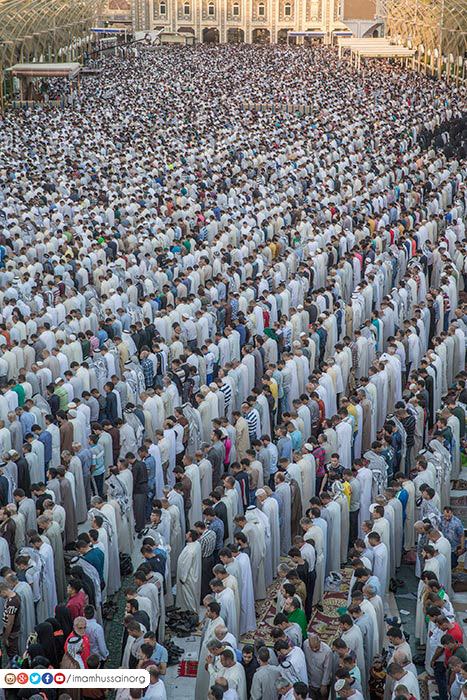مبيّناً: "وقد شهدت العتبتان المقدّستان الحسينية والعباسية وما بينهما اكتظاظاً بأعدادٍ غفيرة من الزائرين وصلت ذروتها بعد ظهر يوم أمس الأربعاء (9ذي الحجّة 1436هـ) الموافق لـ(23أيلول 2015م) وذلك لأداء أعمال يوم عرفة، ومن أهمّ أعمالها المؤكّدة هي زيارة الإمام الحسين(عليه السلام) التي تعادل ألف حجّة وألف عُمرة في يوم عرفة كما ورد في الأثر، ليكون الختام بصلاة العيد المباركة وهي من شعائر الإسلام وقد ارتبطت بعبادة عظيمة ألا هي والحج".